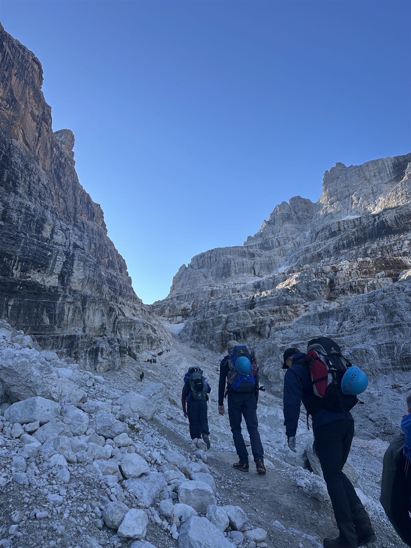 Aufstieg durch das "Bochetta dei due Denti" zur Cima Susat (2859 ). Abstieg über den Sentiero Castiglioni zur Zwölf-Apostel-Hütte (2489 m), Besichtigung der Felsenkirche und Mittagspause. Über den Sentiero dell Ideale zur Camosci Scharte (2784 m). Abstieg über den Comosci Gletscher auf dem Sentiero Martinaz zum Rifugio Brentei (2182 m). Kaffeepause auf der Brentei Hütte. Abstieg über die Galleria Bognani zur urgemütlichen Casinei Hütte (1850 m)