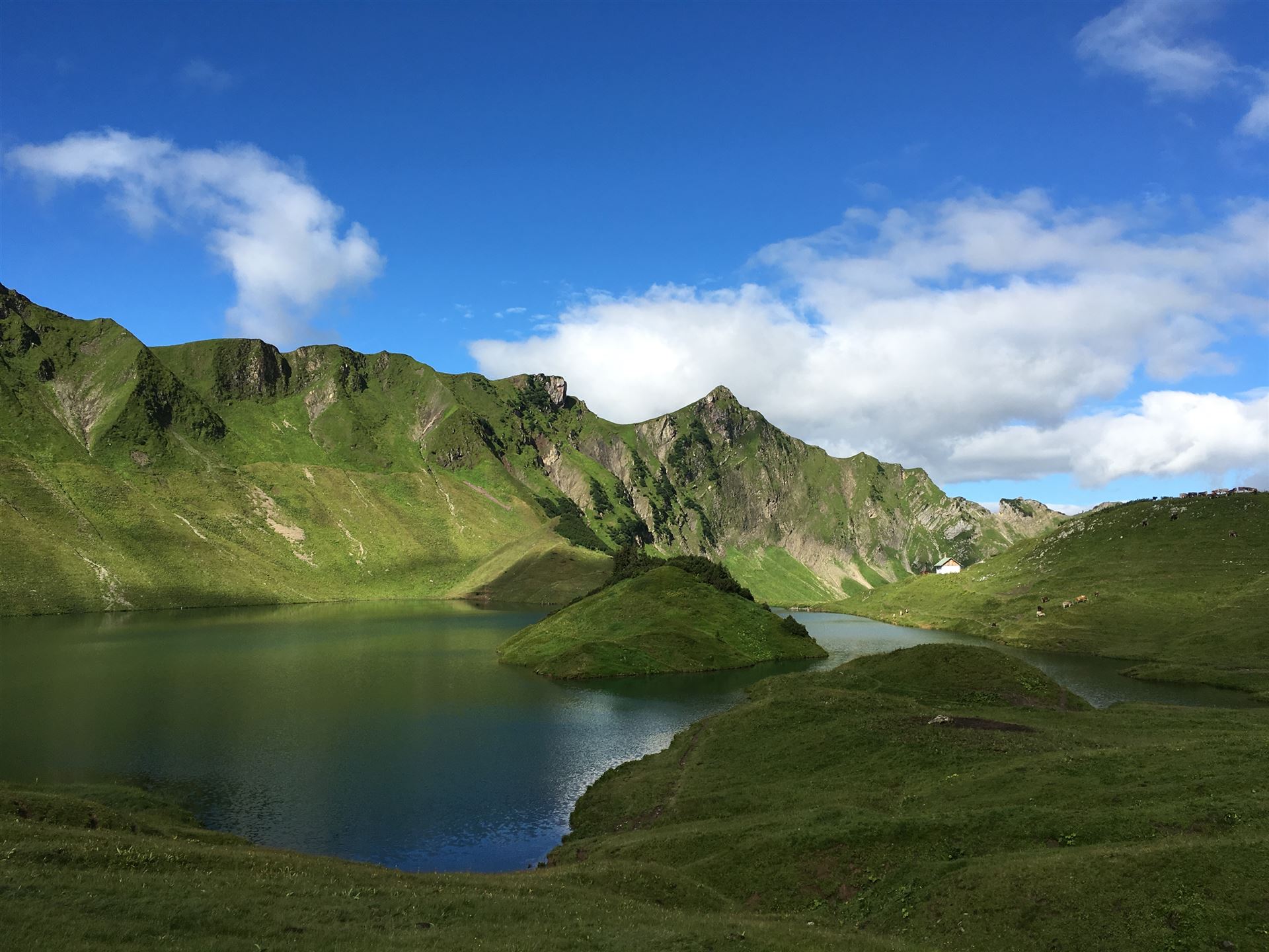 Aufstieg zum Geißeckjoch (2050 m) mit Blick auf den Vilsalpsee, vorbei an Rauhhorn (2240 m) und Kugelhorn (2126 m) zum bekannten Schrecksee (1813 m). Auf dem Saalfelder Höhenweg zur Landsberger Hütte (1810 m).