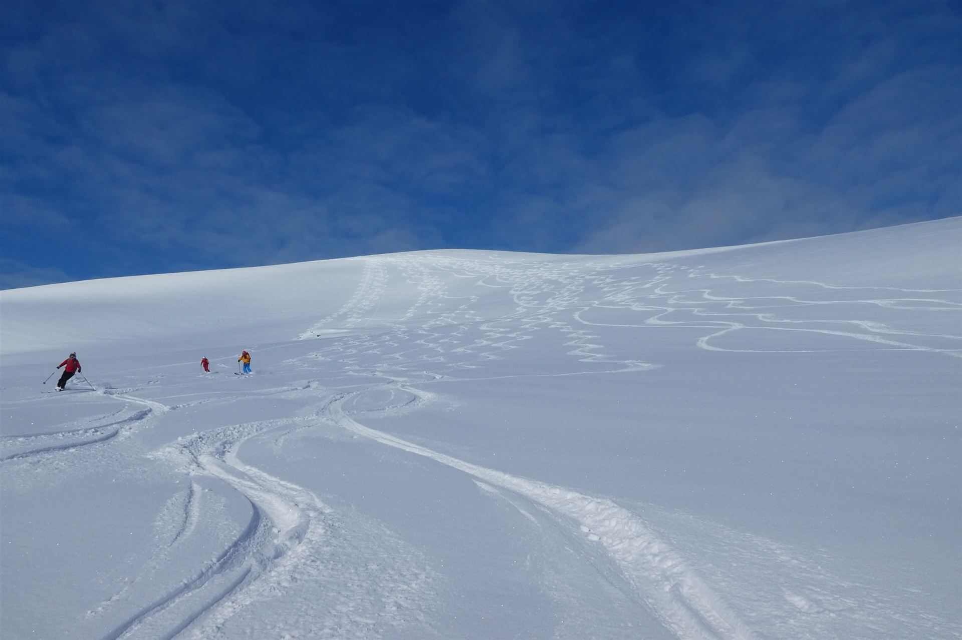 Skitouren in bis zu drei Gruppen direkt vom Boot bzw. Strand zum Gipfel und zurück. Die Gruppen besteigen je nach Level verschiedene Gipfelziele. Durch die Gruppenbildung kann jeder Teilnehmer täglich auf seiner persönlichen Traumtour unterwegs sein.